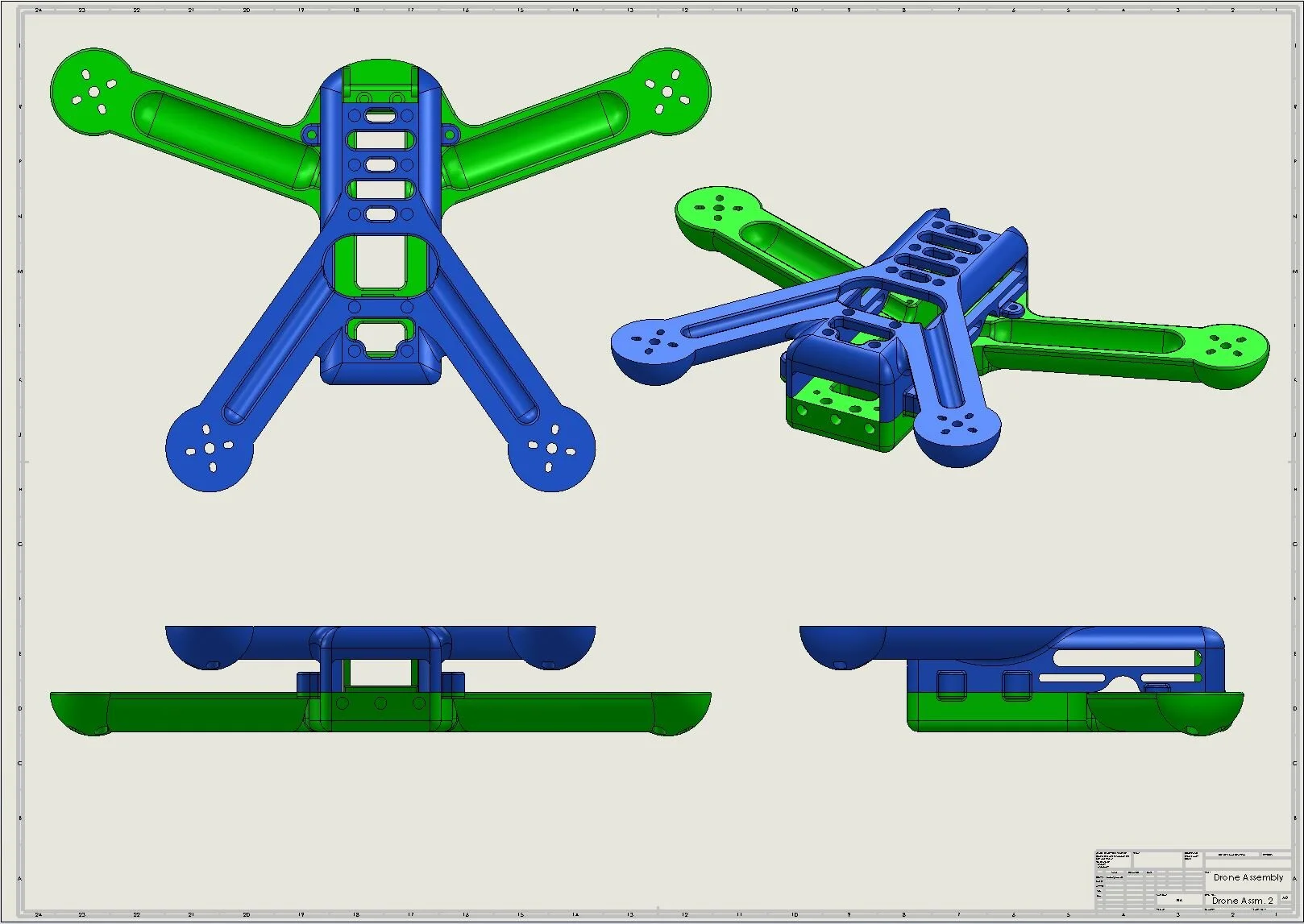 The first stage of this project involved designing the 3D-printed frame. Unlike the popular carbon fiber frames that saturate the frame market, this frame could not be a simple, flat extrusion of a profile sketch. Instead, I had to use my knowledge and intuition of solid mechanics and aerospace structures to design a frame that could be made of PLA plastic and still withstand the stresses of inherent to drone flight and the occasional crash.